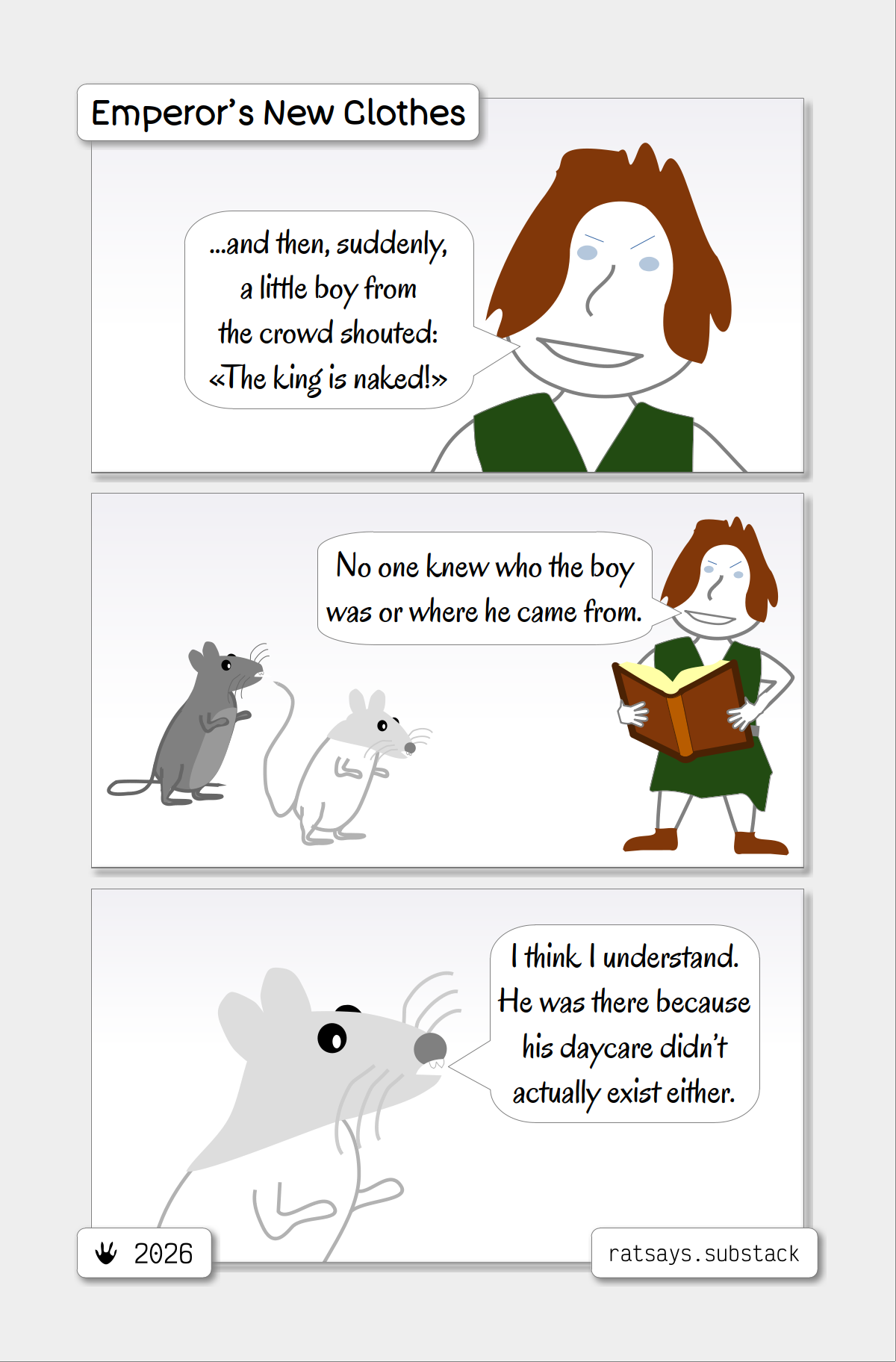 Human’s Human: — ...and then, suddenly, a little boy from the crowd shouted: «The king is naked!» Human’s Human: — No one knew who the boy was or where he came from. Rat: — I think I understand. He was there because his daycare didn’t actually exist either.