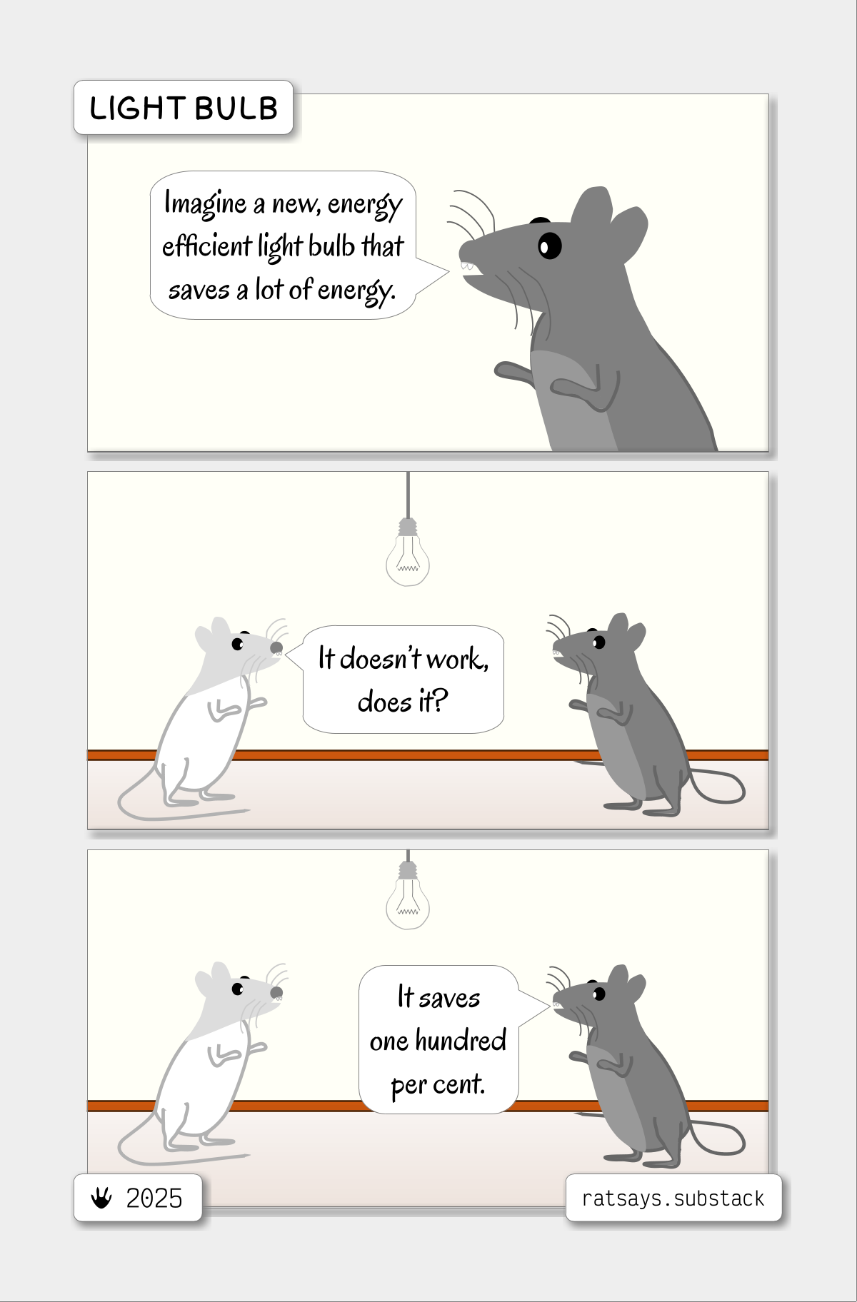Light BulbIn which Cousin innovates againJun 02, 20254768ShareGood time of day, humans!Transcript:Cousin: — Imagine a new, energy efficient light bulb that saves a lot of energy.Rat: — It doesn’t work, does it?Cousin: — It saves one hundred per cent.SharePreviousNext