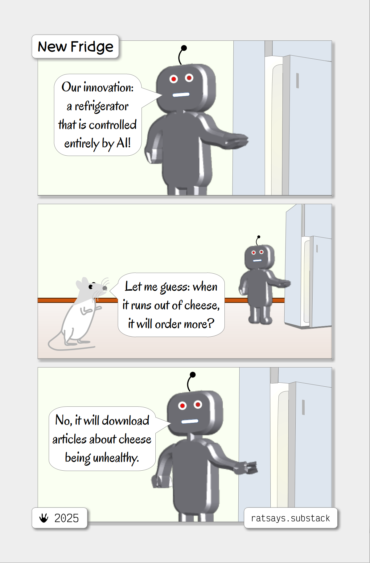 Robot: — Our innovation: a refrigerator that is controlled entirely by AI!