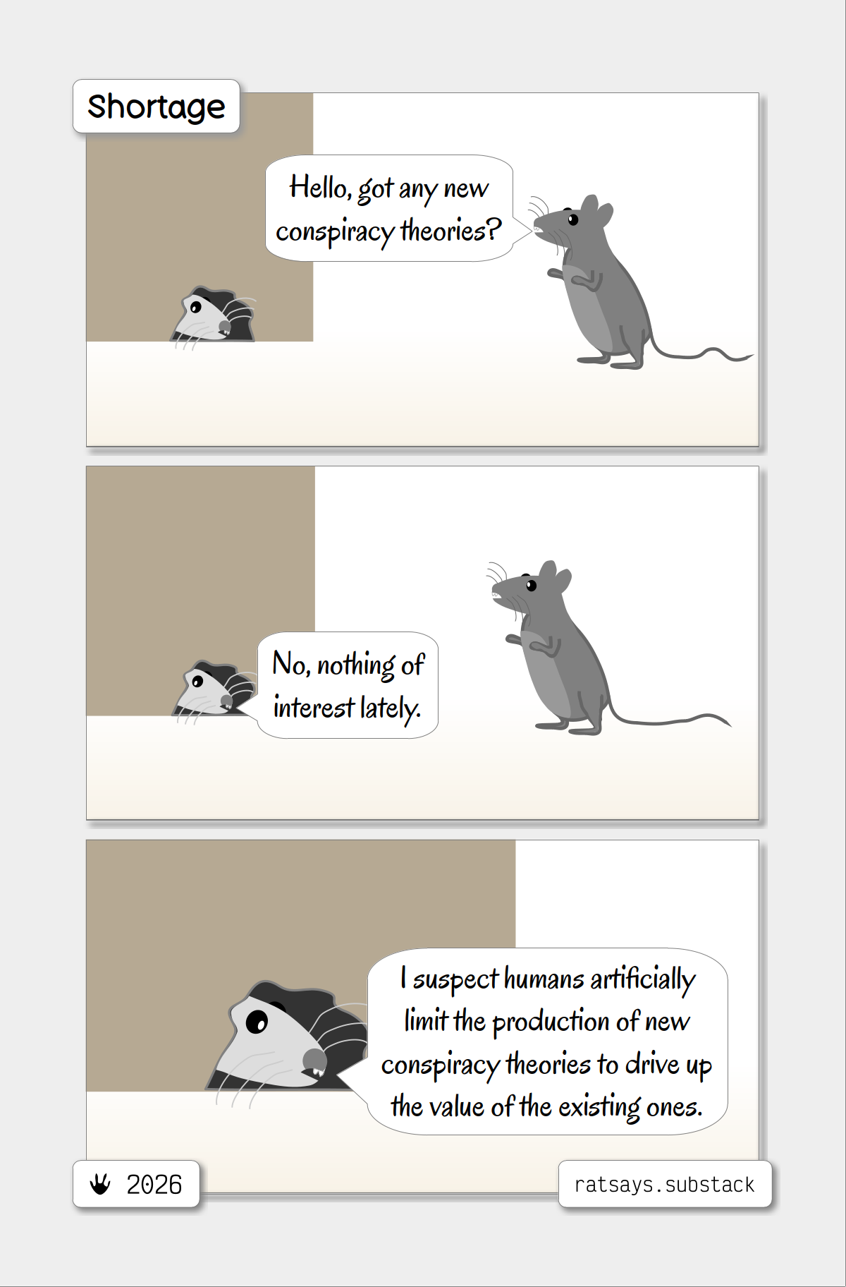 Rat: — I suspect humans artificially limit the production of new conspiracy theories to drive up the value of the existing ones.