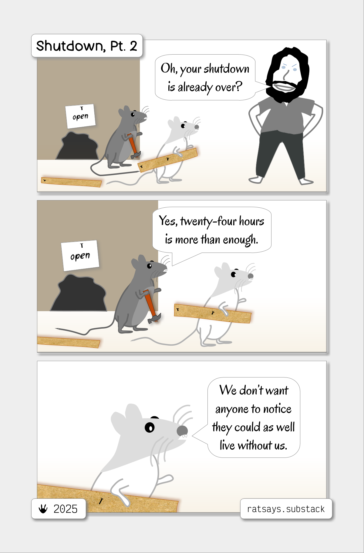 Shutdown, Pt. 2In which Rats exercise moderationSep 30, 20254579ShareGood time of the day, humans!Transcript:Human: β Oh, your shutdown is already over?Cousin: β Yes, twenty-four hours is more than enough.Rat: β We donβt want anyone to notice they could as well live without us.SharePreviousNext