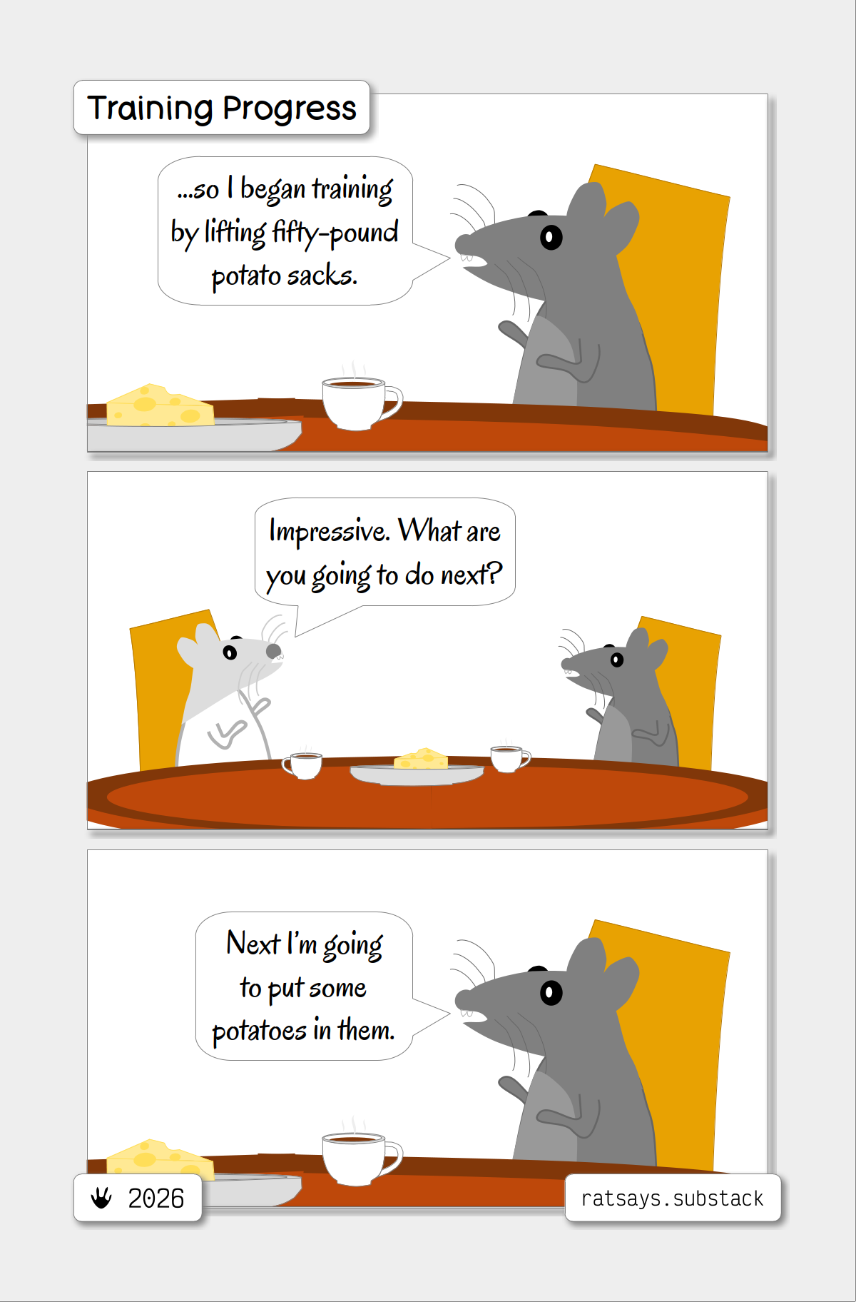 Training ProgressIn which Cousin has ambitious plansApr 13, 20263665ShareGood time of the day, humans!Transcript:Cousin: ā ...so I began training by lifting fifty-pound potato sacks.Rat: ā Impressive. What are you going to do next?Cousin: ā Next Iām going to put some potatoes in them.SharePreviousNext