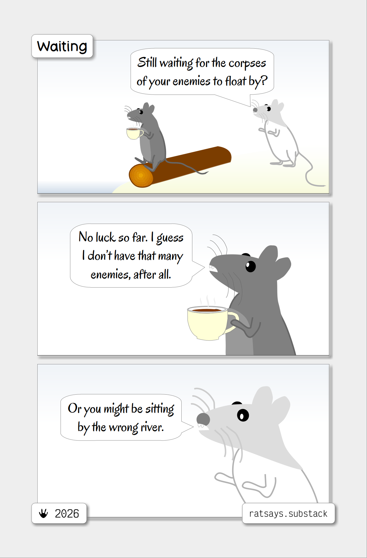 WaitingIn which Rat has doubtsMar 16, 20263774ShareGood time of the day, humans!Transcript:Rat: — Still waiting for the corpses of your enemies to float by?Cousin: — No luck so far. I guess I don’t have that many enemies, after all.Rat: — Or you might be sitting by the wrong river.SharePreviousNext
